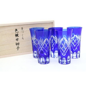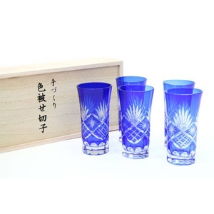 透明ガラスの外側に色ガラスを二重に手吹きで成形し、絵柄は手彫りで一本一本色ガラス表面を削り取り、透明ガラスを見せることで独特の文様を作り出しています。